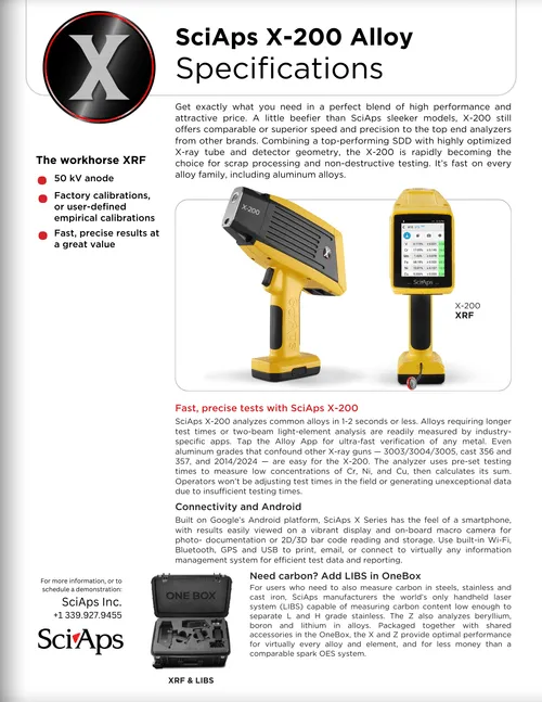 X-200将高性能的硅漂移探测器与高度优化的X射线管和探测器几何形状相结合,正在迅速成为废料加工和无损测试的选择。它在每个合金家族上都很快,包括铝合金。