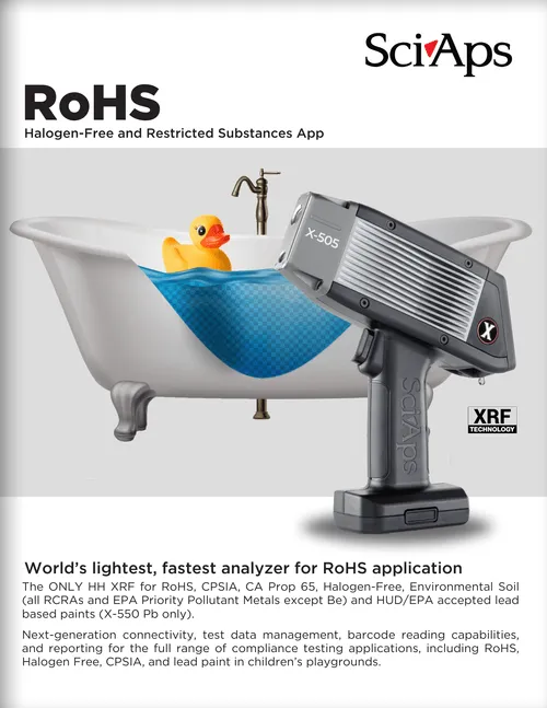 SciAps X-505旨在测试消费品和原材料是否存在某些潜在危险元素。RoHS模式专门针对检测Pb、Hg、Cd、Br和Cr。它还可以测量Cl、As、Se、Ag、Sn、Sb、Ba。