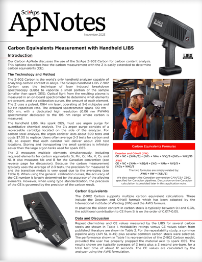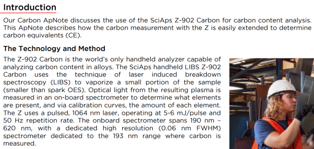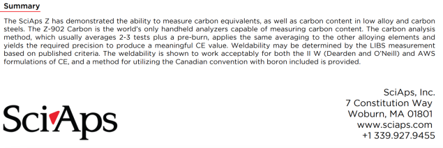 | Our Carbon ApNote discusses the use of the SciAps Z-902 Carbon for carbon content analysis. This ApNote describes how the carbon measurement with the Z is easily extended to determine carbon equivalents (CE). |