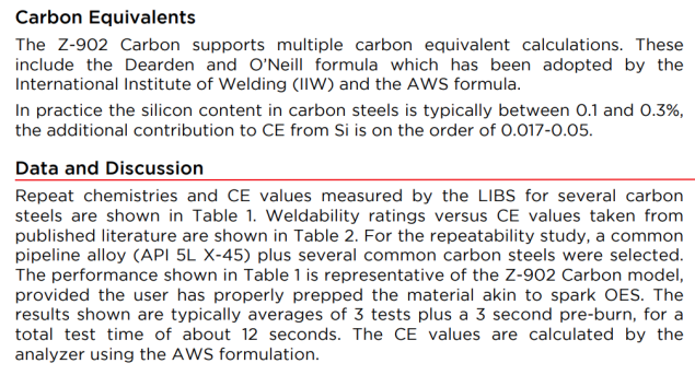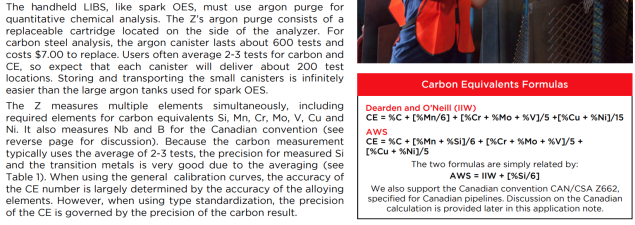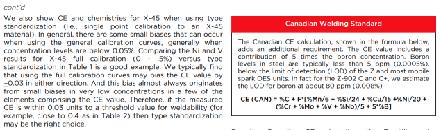 | The Canadian CE calculation, shown in the formula below, adds an additional requirement. The CE value includes a contribution of 5 times the boron concentration. Boron levels in steel are typically less than 5 ppm (0.0005%), below the limit of detection (LOD) of the Z and most mobile spark OES units. In fact for the Z-902 C and C+, we estimate the LOD for boron at about 80 ppm (0.008%) |
