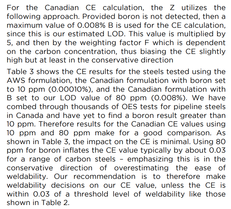 | Table 3 shows the CE results for the steels tested using the AWS formulation, the Canadian formulation with boron set to 10 ppm (0.00010%), and the Canadian formulation with B set to our LOD value of 80 ppm (0.008%). We have combed through thousands of OES tests for pipeline steels in Canada and have yet to find a boron result greater than 10 ppm. Therefore results for the Canadian CE values using 10 ppm and 80 ppm make for a good comparison. As shown in Table 3, the impact on the CE is minimal. Using 80 ppm for boron inflates the CE value typically by about 0.03 for a range of carbon steels – emphasizing this is in the conservative direction of overestimating the ease of weldability. Our recommendation is to therefore make weldability decisions on our CE value, unless the CE is within 0.03 of a threshold level of weldability like those shown in Table 2. |