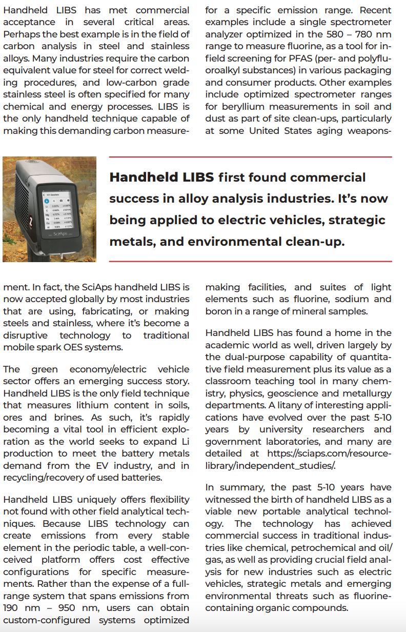 | In summary, the past 5-10 years have witnessed the birth of handheld LIBS as a viable new portable analytical technology. The technology has achieved commercial success in traditional industries like chemical, petrochemical and oil/ gas, as well as providing crucial field analysis for new industries such as electric vehicles, strategic metals and emerging environmental threats such as fluorine-containing organic compounds. |
